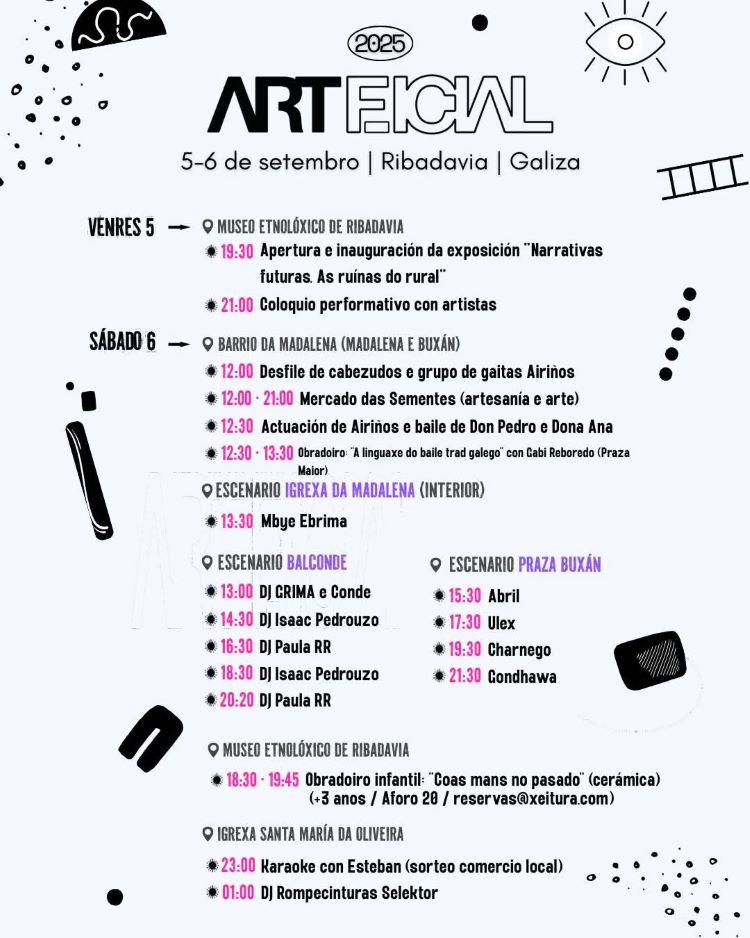 O Festival Arteficial completa a súa proposta de concertos e actividades para a súa última edición, que se celebrará os días 5 e 6 de setembro (venres e sábado) no Museo Etnolóxico de Ribadavia, nos arredores e no interior da Praza da Madalena e no adro da Igrexa da Oliveira, todos eles espazos situados dentro do conxunto histórico de Ribadavia.
