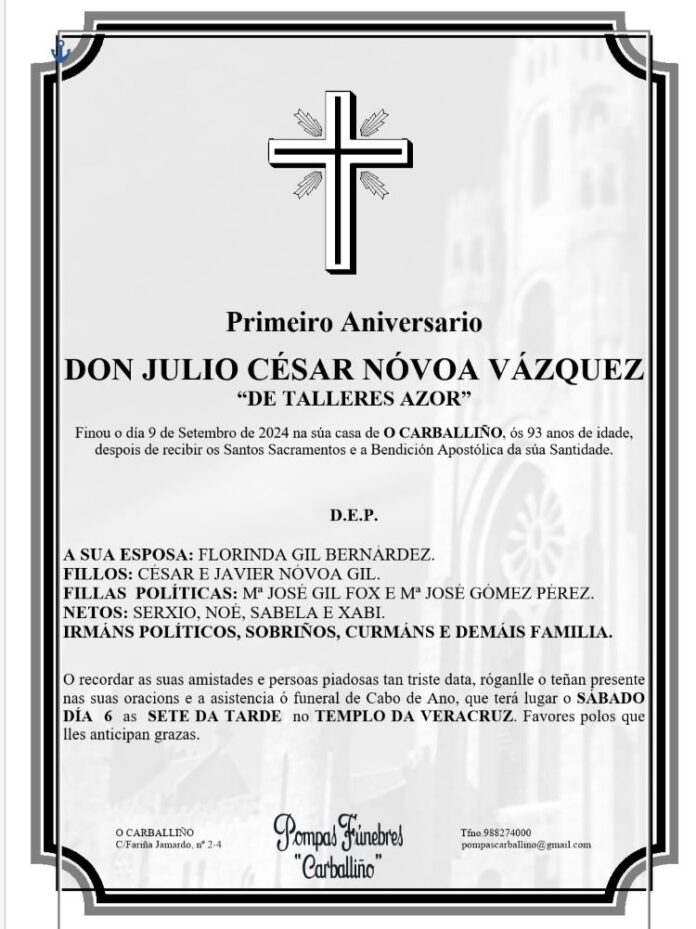 Esquelas Primeiro aniversario de D. Julio César Nóvoa Vázquez (de Talleres Azor) 5 Setembro, 2025 FacebookTwitterWhatsAppLinkedinEmail PULPO BEATS Escola de Música Moderna no Carballiño PULPO BEATS Escola de Música Moderna no Carballiño ---------------------------------------------------------------------------------------------------------- PUBLICIDADE PRECASA: Ferretería e Materiales de construcción PRECASA: Ferretería e Materiales de construcción --------------------------------------------------------------------------------------------------- GRILL-CARBALLIÑO e OURENSE GRILL-CARBALLIÑO e OURENSE