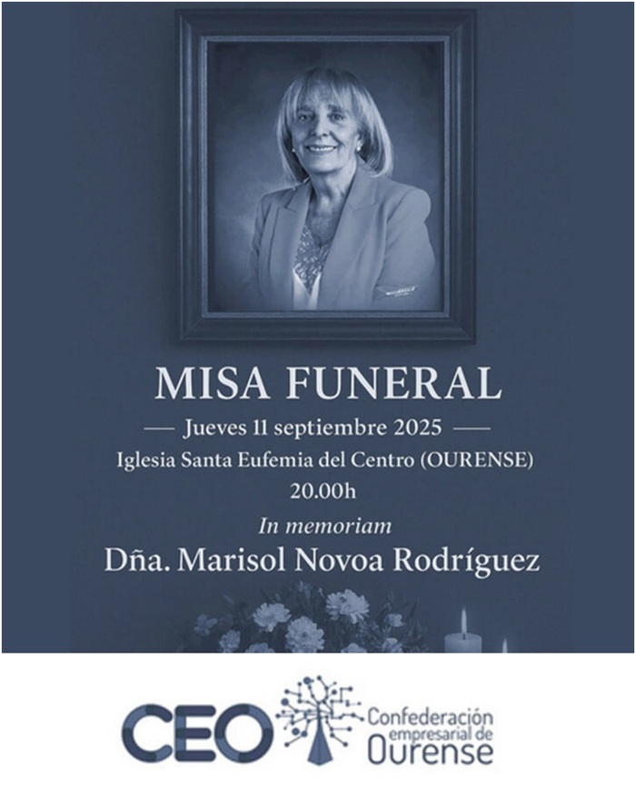 La Confederación Empresarial de Ourense (CEO) comunica de que el próximo jueves 11 de septiembre de 2025, a las 20:00 horas, se celebrará una misa funeral in memoriam de Dña. Marisol Novoa Rodríguez, anterior presidenta de esta entidad, en la Iglesia de Santa Eufemia del Centro (Ourense).