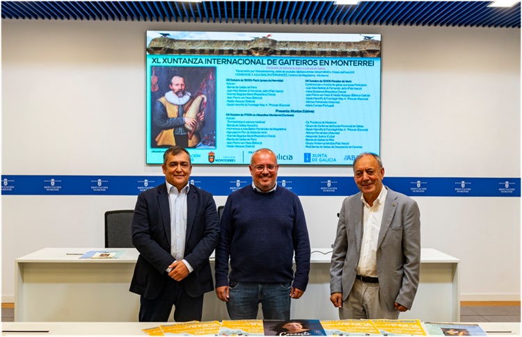 O vicepresidente segundo da Deputación e deputado de Cultura, César Fernández; o alcalde de Monterrei, José Luis Suárez; e o director da Escola de Gaitas da Deputación, Xosé Lois Foxo, presentaron hoxe os detalles do programa.