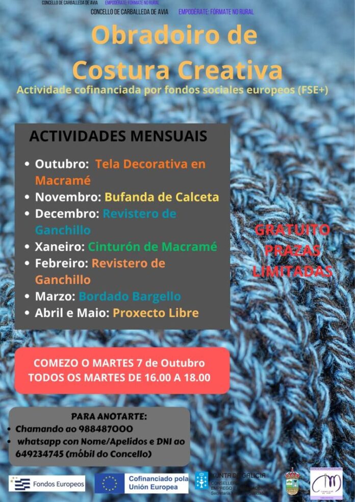 O Concello de Carballeda de Avia ten programado para este curso 2025/2026 un obradoiro de costura creativa, que se vén desenvolvendo dende o pasado 7 de setembro e que está impartido por un técnico da empresa ‘Madejas Tejerlo’, e que ten lugar na sala multiusos da Casa do Concello, tódolos martes, de 16,00 a 18,00 horas.