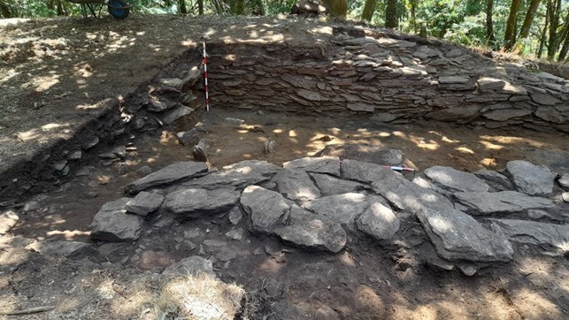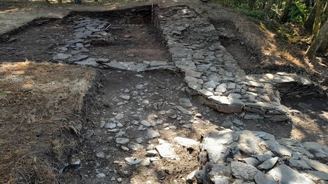 sobre a mesma, presentando unha anchura duns 60 cm. Tamén se localizou una lareira feita a base de pedras fincadas e lousas de xisto planas, asociada aos restos dun pavimento e aos buratos de poste para suxeitar algunha estrutura feita con materiais perecedoiros. Por debaixo, estarían os restos dunha cabana circular feita con dobre fiada de pedras fincadas e restos de zona de combustión. Finalmente indicar que as datacións de C14 de materiais recollidos nesta zona de combustión xa rexistrada na campaña do ano 2024 indican una cronoloxía de finais do s. IV a. C.- principios do III a. C.