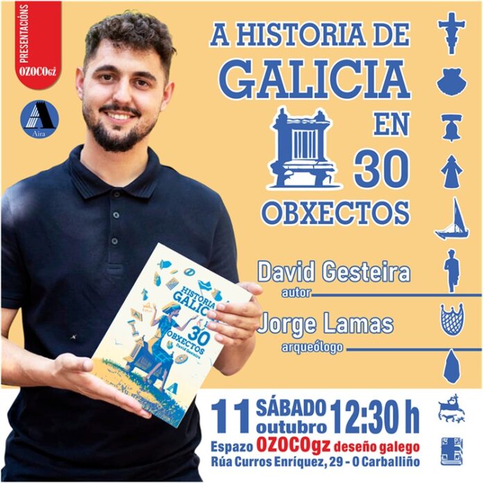 Presentación de A HISTORIA DE GALICIA EN 30 OBXECTOS, de David Gesteira, acompañado polo arqueólogo carballiñés Jorge Lamas.