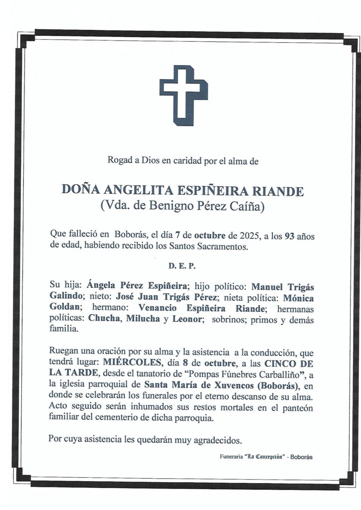 Agradecemento da familia de Dª Angelita Espiñeira Riande
