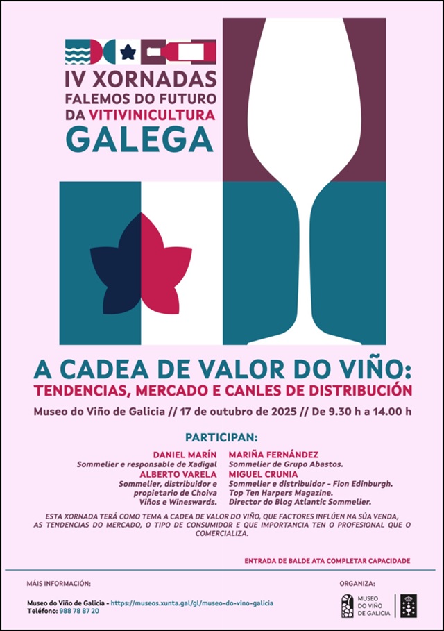 O Museo do Viño de Galicia acollerá unha xornada centrada na análise da cadea de valor do viño. O evento abordará os factores que inflúen na súa venda, as tendencias actuais do mercado, o perfil do consumidor e o papel fundamental do profesional que o comercializa.