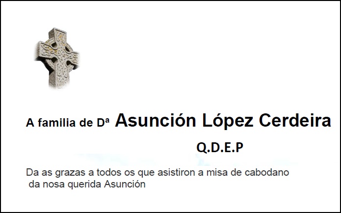 La familia agradece a todas las personas asistieron al funeral de CABO DE AÑO, que tuvo lugar el SÁBADO día 18 DE Octubre a las 17:30 EN LA IGLESIA PARROQUIAL DE SAN PEDRO DE O REGUEIRO .