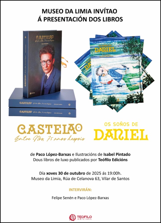 Coincidindo co 75 aniversario da morte de Castelao, o escritor e xornalista da Limia, Paco López-Barxas, ven de publicar dous libros singulares e fermosamente editados por Teófilo Edicións: “Castelao entre Nós” e “Os soños de Daniel”. Dous libros de luxo, ilustrados por Isabel Pintado, para o luxo dunha figura que, no plano cultural e político, artístico e literario, puxo a Galicia no mapa de Fontán: o mesmo mapa que simbólicamente comparte protagonismo gráfico e textual nos dous libros.