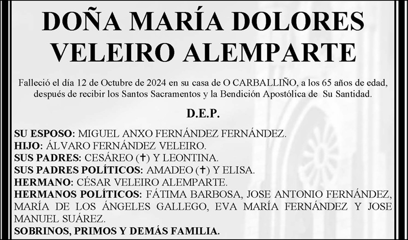 A familia e os amigos de Dona María Dolores Veleiro Alemparte (Lola Veleiro), que faleceu o 12 de Outubro de 2024 teñen o sentimento de convidarlles a