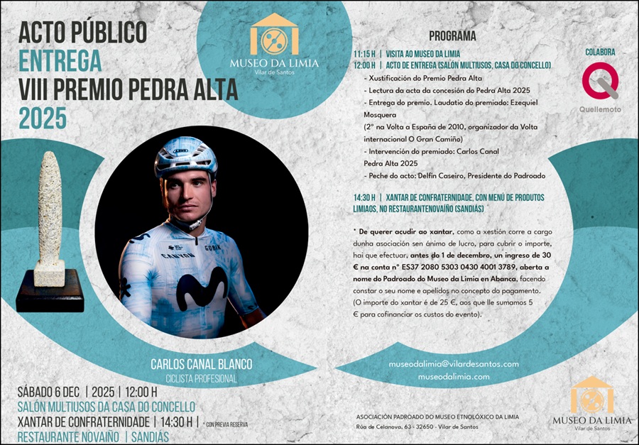 O sábado, 6 de decembro, o ciclista limiao Carlos Canal recibirá o Premio Pedra Alta, que anualmente concede o Padroado do Museo da Limia