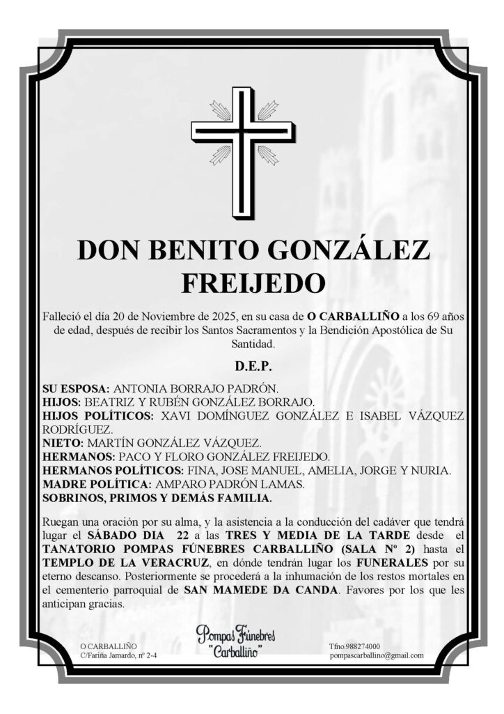 Esquelas Falecemento de D Benito González Freijedo 20 Novembro, 2025 FacebookTwitterWhatsAppLinkedinEmail TEATRO PRINCIPAL PROGRAMACIÓN NOVEMBRO TEATRO PRINCIPAL PROGRAMACIÓN NOVEMBRO ---------------------------------------------------------------------------------------------------------- TEATRO PRINCIPAL PROGRAMACIÓN NOVEMBRO TEATRO PRINCIPAL PROGRAMACIÓN NOVEMBRO A túa Familia non te esquece FUNERAIS NO TEMPLO DA VERACRUZ CARBALLIÑO – GRILL PRECASA COMERCIAL ORCELLON OS MELLORES ESTABLECEMENTOS PULPO BEATS Escola de Música Moderna e Baile Tradicional Galego no Carballiño PULPO BEATS Escola de Música Moderna e Baile Tradicional Galego no Carballiño ---------------------------------------------------------------------------------------------------------- TANATORIO POMPAS FÚNEBRES LOCALIZACIÓN PREMER NA IMAXE PUBLICIDADE--------------------------------------------------------------------------------------------------- GRILL-CARBALLIÑO e OURENSE GRILL-CARBALLIÑO e OURENSE COMERCIAL ORCELLÓN COMERCIAL ORCELLÓN PRECASA: Ferretería e Materiales de construcción PRECASA: Ferretería e Materiales de construcción