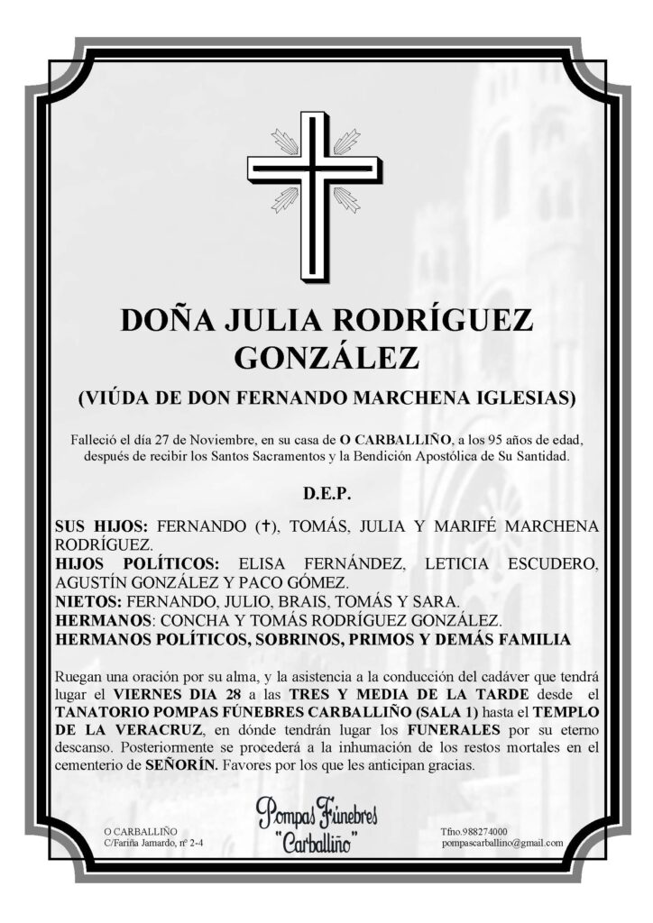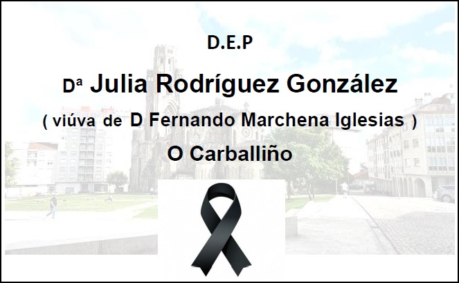 Esquelas Falecemento de Dª Julia Rodríguez González 27 Novembro, 2025 FacebookTwitterWhatsAppLinkedinEmail TEATRO PRINCIPAL PROGRAMACIÓN NOVEMBRO TEATRO PRINCIPAL PROGRAMACIÓN NOVEMBRO ---------------------------------------------------------------------------------------------------------- TEATRO PRINCIPAL PROGRAMACIÓN NOVEMBRO TEATRO PRINCIPAL PROGRAMACIÓN NOVEMBRO A túa Familia non te esquece FUNERAIS NO TEMPLO DA VERACRUZ CARBALLIÑO – GRILL PRECASA COMERCIAL ORCELLON OS MELLORES ESTABLECEMENTOS PULPO BEATS Escola de Música Moderna e Baile Tradicional Galego no Carballiño PULPO BEATS Escola de Música Moderna e Baile Tradicional Galego no Carballiño ---------------------------------------------------------------------------------------------------------- TANATORIO POMPAS FÚNEBRES LOCALIZACIÓN PREMER NA IMAXE PUBLICIDADE--------------------------------------------------------------------------------------------------- GRILL-CARBALLIÑO e OURENSE GRILL-CARBALLIÑO e OURENSE COMERCIAL ORCELLÓN COMERCIAL ORCELLÓN PRECASA: Ferretería e Materiales de construcción PRECASA: Ferretería e Materiales de construcción