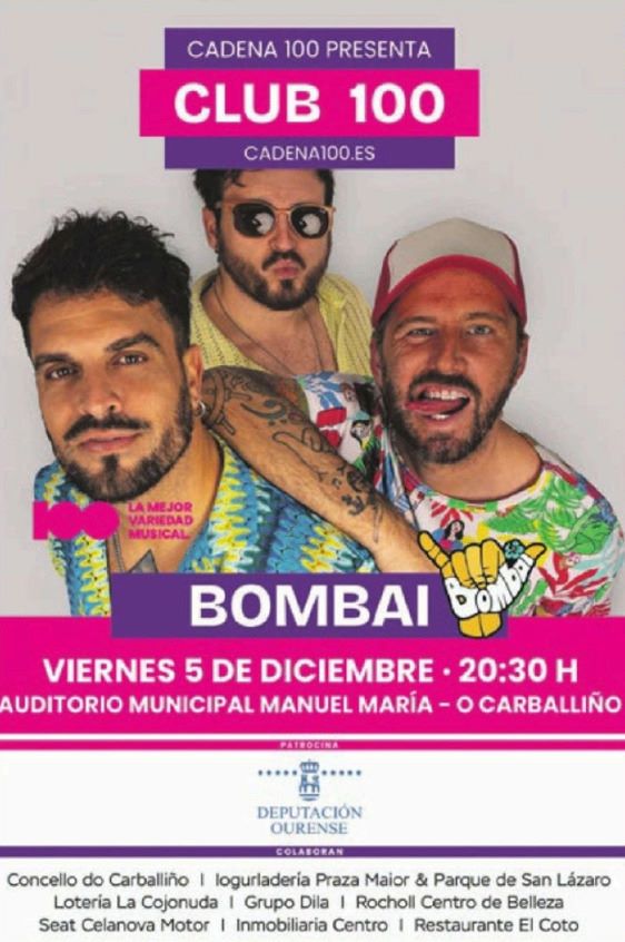 O Auditorio Manuel María do Carballiño acollerá o venres 5 de decembro a partir das 20,30 horas o concerto do grupo valenciano Bombai, autor de temas tan coñecidos como “Solo si es contigo” ou “Tú me has cambiado”. A cita, enmarcada na programación de Nadal da Concellería de Cultura, está organizada por Cadena 100 e conta coa colaboración do Concello.
