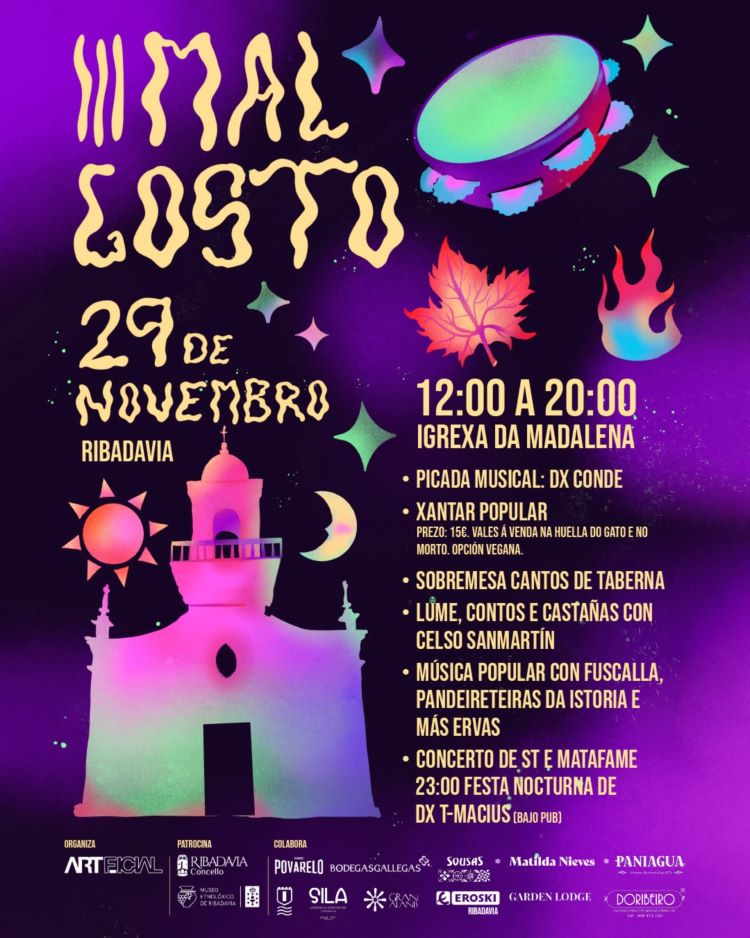 A Asociación Cultural Arteficial celebra unha nova edición do Malgosto, unha proposta singular que reinterpreta a tradición do magosto cunha mirada humorística, creativa e comunitaria. O evento esténdese entre hoxe, venres día 28, e mañá, sábado 29 de novembro, combinando xantar popular, memoria oral, contos da tradición popular, música tradicional, gastronomía e electrónica nocturna. O evento está organizado pola asociación Arteficial co apoio do Concello de Ribadavia, O Museo Etnolóxico de Ribadavia e a Consellería de Cultura,