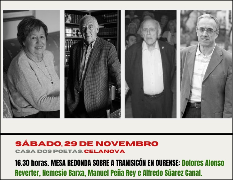 Pola tarde, celebrarase a mesa redonda baixo o título A Transición en Ourense. Comezará as 16.30 horas no mesmo escenario da Casa dos Poetas, un coloquio moderado por Moncho Boán, membro do Comité de Memoria Histórica da Comarca de Celanova, que reunirá a catro personalidades destacadas da loita antifranquista no país e especialmente en Ourense desde posicións e militancias comunistas e nacionalistas.