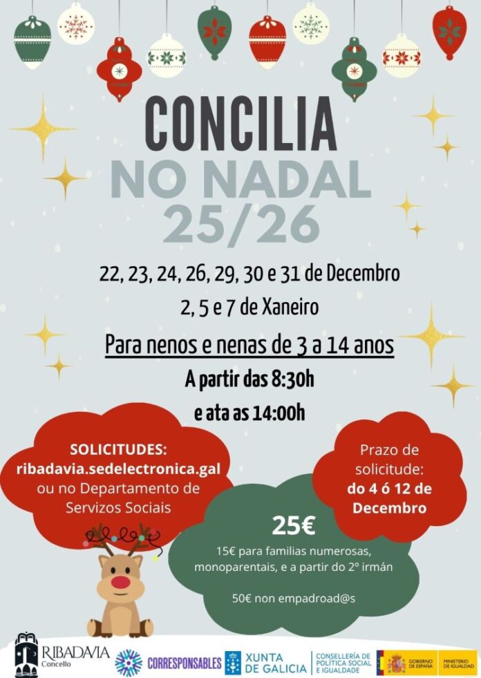O Concello de Ribadavia vén de anunciar a posta en marcha dunha nova edición do programa ‘Concilia no Nadal 2025-26’, unha iniciativa que pretende facilitar a conciliación da vida familiar e laboral durante as vacacións de Nadal ao tempo que ofrece ás crianzas un entorno educativo, seguro e enriquecedor. O goberno local subliña que este servizo, xa consolidado no municipio, busca tanto apoiar ás familias nos días non lectivos como promover o desenvolvemento persoal e a autonomía dos nenos e nenas participantes.