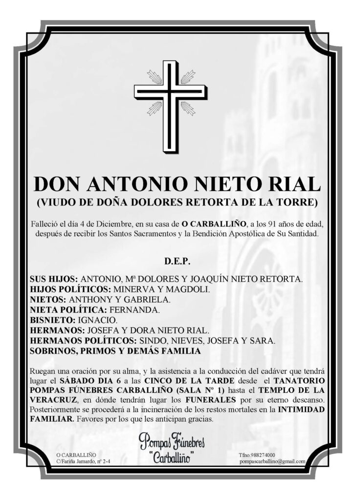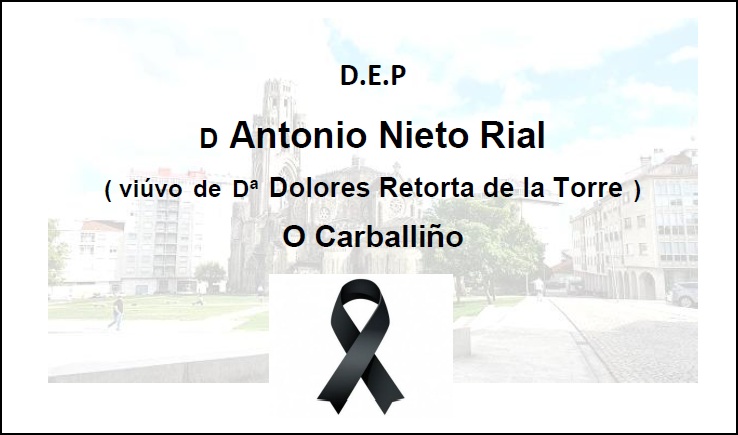 Esquelas Falecemento de D Antonio Nieto Rial 5 Decembro, 2025 FacebookTwitterWhatsAppLinkedinEmail TEATRO PRINCIPAL PROGRAMACIÓN NOVEMBRO TEATRO PRINCIPAL PROGRAMACIÓN NOVEMBRO ---------------------------------------------------------------------------------------------------------- TEATRO PRINCIPAL PROGRAMACIÓN NOVEMBRO TEATRO PRINCIPAL PROGRAMACIÓN NOVEMBRO A túa Familia non te esquece FUNERAIS NO TEMPLO DA VERACRUZ CARBALLIÑO – GRILL PRECASA COMERCIAL ORCELLON OS MELLORES ESTABLECEMENTOS PULPO BEATS Escola de Música Moderna e Baile Tradicional Galego no Carballiño PULPO BEATS Escola de Música Moderna e Baile Tradicional Galego no Carballiño ---------------------------------------------------------------------------------------------------------- TANATORIO POMPAS FÚNEBRES LOCALIZACIÓN PREMER NA IMAXE PUBLICIDADE--------------------------------------------------------------------------------------------------- GRILL-CARBALLIÑO e OURENSE GRILL-CARBALLIÑO e OURENSE COMERCIAL ORCELLÓN COMERCIAL ORCELLÓN PRECASA: Ferretería e Materiales de construcción PRECASA: Ferretería e Materiales de construcción