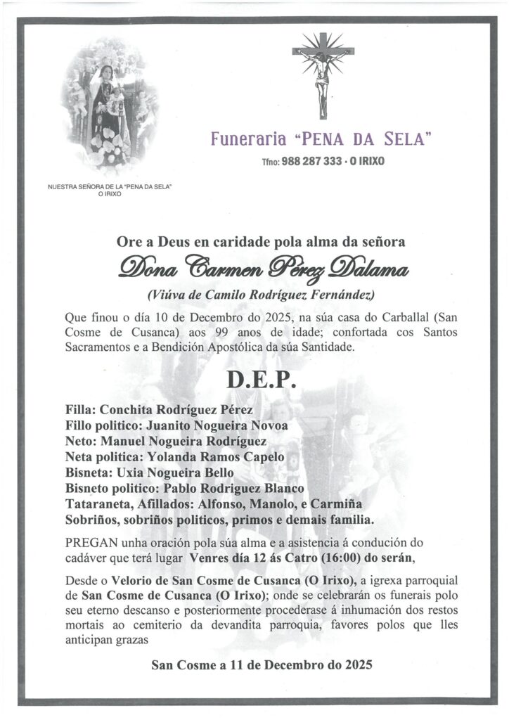 Esquelas Falecemento de Dª Carmen Pérez Dalama 11 Decembro, 2025 FacebookTwitterWhatsAppLinkedinEmail TEATRO PRINCIPAL PROGRAMACIÓN NOVEMBRO TEATRO PRINCIPAL PROGRAMACIÓN NOVEMBRO ---------------------------------------------------------------------------------------------------------- TEATRO PRINCIPAL PROGRAMACIÓN NOVEMBRO TEATRO PRINCIPAL PROGRAMACIÓN NOVEMBRO A túa Familia non te esquece FUNERAL NA IGREXA DE SAN COSME DE CUSANCA LOCALIZACIÓN: Premer na Imaxe PUBLICIDADE--------------------------------------------------------------------------------------------------- GRILL-CARBALLIÑO e OURENSE GRILL-CARBALLIÑO e OURENSE COMERCIAL ORCELLÓN COMERCIAL ORCELLÓN PRECASA: Ferretería e Materiales de construcción PRECASA: Ferretería e Materiales de construcción