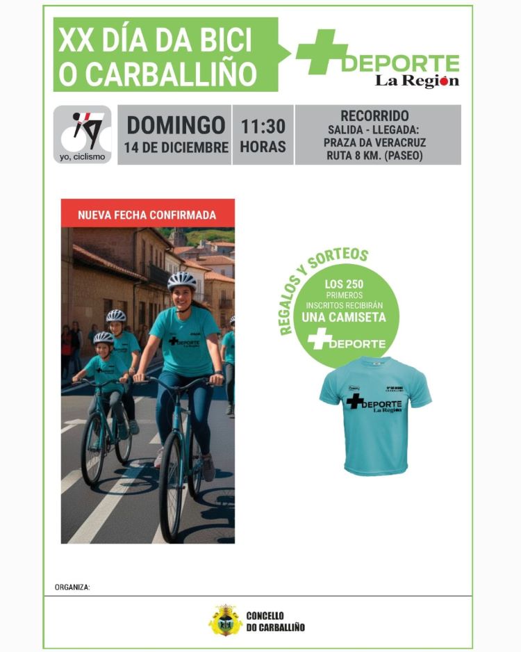 O Concello do Carballiño impulsa este domingo, 14 de decembro, o ‘XX Día da Bici’ en colaboración con +Deporte La Región, o Ximnasio Korpore e o club ciclista Carballiño Sobre Rodas. A actividade, gratuíta, está dirixida a poboación de todas as idades co obxectivo de desfrutar dunha xornada familiar, deportiva e divertida, na que haberá agasallos, sorpresas e animación musical. “Este ano fixemos algúns cambios, temos tres carreiras diferentes por idades, pensadas para os máis pequenos, os rapaces e os adultos”, detalla José Castro, concelleiro de Deportes.