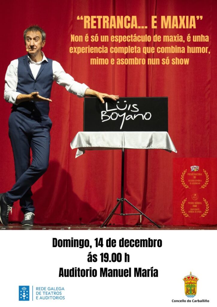 O coñecido mago Luis Boyano, pola súa parte, actuará no Auditorio Municipal, mañá, domingo, ás 19,00 horas, co seu espectáculo “Retranca … e maxia”, incluído na Rede Galega de Teatros e Auditorios. O artista, moi querido no Carballiño, presenta un show para público de todas as idades onde se misturan a maxia, a sorpresa e o humor para deixar ao público sen fala. As entradas pódense adquirir na taquilla do Auditorio por 5 euros.