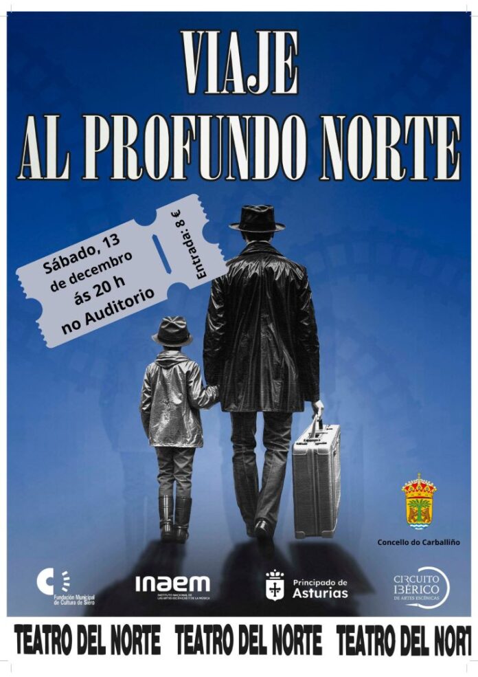 Hoxe, sábado, será a quenda de Teatro del Norte, que presentarán ás 20,00 horas no Auditorio Municipal a peza “Viaje al profundo norte”. Trátase dunha obra creada en 1987 e que neste 2025, cando a compañía cumpre 40 anos, volve aos escenarios cunha renovada proposta. Os personaxes reflexionan sobre o paso do tempo, o pasado que non volverá e os sentimentos que aparecen na vellez, como a soidade ou o medo. A entrada ten un custe de 8 euros e poderase adquirir na taquilla do Auditorio.