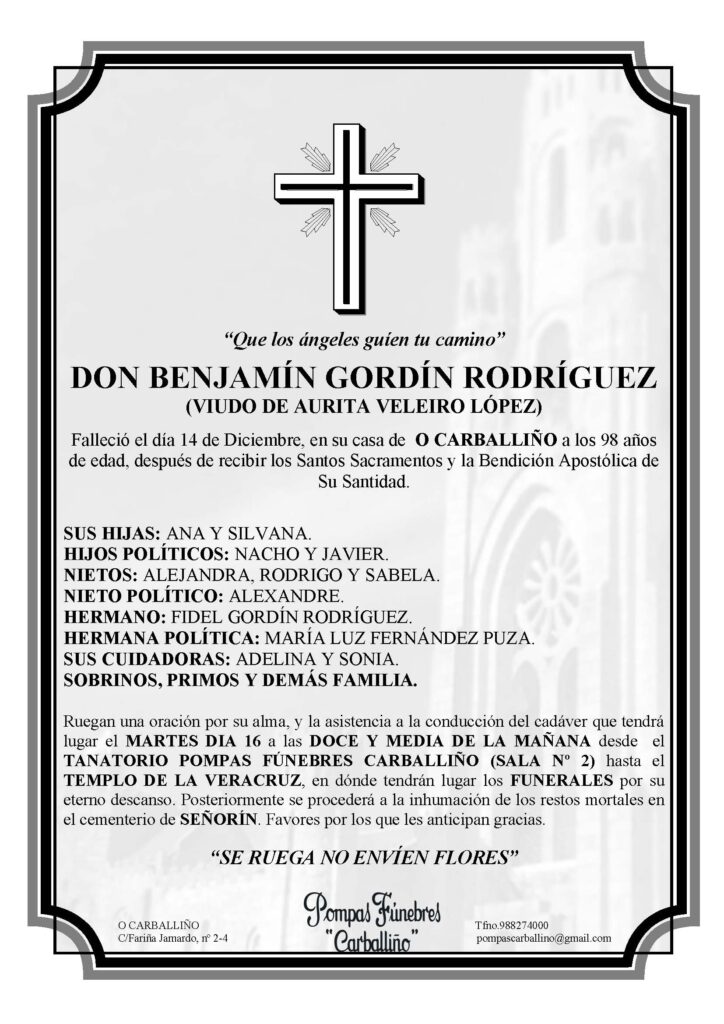 Esquelas Falecemento de D Benjamín Gordín Rodríguez 15 Decembro, 2025 FacebookTwitterWhatsAppLinkedinEmail TEATRO PRINCIPAL PROGRAMACIÓN NOVEMBRO TEATRO PRINCIPAL PROGRAMACIÓN NOVEMBRO ---------------------------------------------------------------------------------------------------------- TEATRO PRINCIPAL PROGRAMACIÓN NOVEMBRO TEATRO PRINCIPAL PROGRAMACIÓN NOVEMBRO A túa Familia non te esquece FUNERAIS NO TEMPLO DA VERA CRUZ CARBALLIÑO – GRILL PRECASA COMERCIAL ORCELLON OS MELLORES ESTABLECEMENTOS PULPO BEATS Escola de Música Moderna e Baile Tradicional Galego no Carballiño PULPO BEATS Escola de Música Moderna e Baile Tradicional Galego no Carballiño ---------------------------------------------------------------------------------------------------------- TANATORIO POMPAS FÚNEBRES LOCALIZACIÓN PREMER NA IMAXE PUBLICIDADE--------------------------------------------------------------------------------------------------- GRILL-CARBALLIÑO e OURENSE GRILL-CARBALLIÑO e OURENSE COMERCIAL ORCELLÓN COMERCIAL ORCELLÓN PRECASA: Ferretería e Materiales de construcción PRECASA: Ferretería e Materiales de construcción
