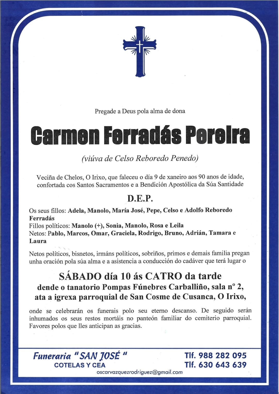 Esquelas Falecemento de Dª Carmen Ferradás Pereira 9 Xaneiro, 2026 FacebookTwitterWhatsAppLinkedinEmail TEATRO PRINCIPAL PROGRAMACIÓN NOVEMBRO TEATRO PRINCIPAL PROGRAMACIÓN NOVEMBRO ---------------------------------------------------------------------------------------------------------- TEATRO PRINCIPAL PROGRAMACIÓN NOVEMBRO TEATRO PRINCIPAL PROGRAMACIÓN NOVEMBRO PUBLICIDADE--------------------------------------------------------------------------------------------------- GRILL-CARBALLIÑO e OURENSE GRILL-CARBALLIÑO e OURENSE COMERCIAL ORCELLÓN COMERCIAL ORCELLÓN PRECASA: Ferretería e Materiales de construcción PRECASA: Ferretería e Materiales de construcción