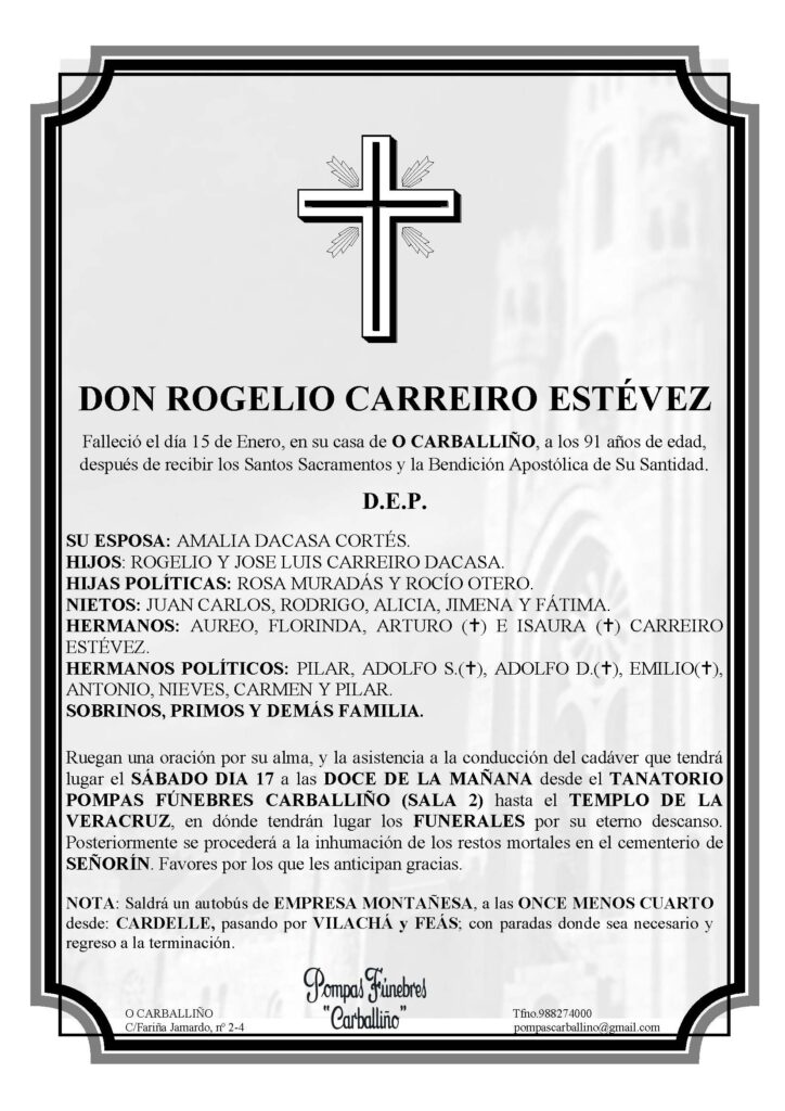 Esquelas Falecemento de D Rogelio Carreiro Estévez 15 Xaneiro, 2026 FacebookTwitterWhatsAppLinkedinEmail TEATRO PRINCIPAL PROGRAMACIÓN NOVEMBRO TEATRO PRINCIPAL PROGRAMACIÓN NOVEMBRO ---------------------------------------------------------------------------------------------------------- TEATRO PRINCIPAL PROGRAMACIÓN NOVEMBRO TEATRO PRINCIPAL PROGRAMACIÓN NOVEMBRO A túa Familia non te esquece FUNERAIS NO TEMPLO DA VERA CRUZ COMERCIAL ORCELLON CARBALLIÑO – GRILL PRECASA OS MELLORES ESTABLECEMENTOS PULPO BEATS Escola de Música Moderna e Baile Tradicional Galego no Carballiño PULPO BEATS Escola de Música Moderna e Baile Tradicional Galego no Carballiño ---------------------------------------------------------------------------------------------------------- TANATORIO POMPAS FÚNEBRES LOCALIZACIÓN PREMER NA IMAXE PUBLICIDADE--------------------------------------------------------------------------------------------------- GRILL-CARBALLIÑO e OURENSE GRILL-CARBALLIÑO e OURENSE COMERCIAL ORCELLÓN COMERCIAL ORCELLÓN PRECASA: Ferretería e Materiales de construcción PRECASA: Ferretería e Materiales de construcción