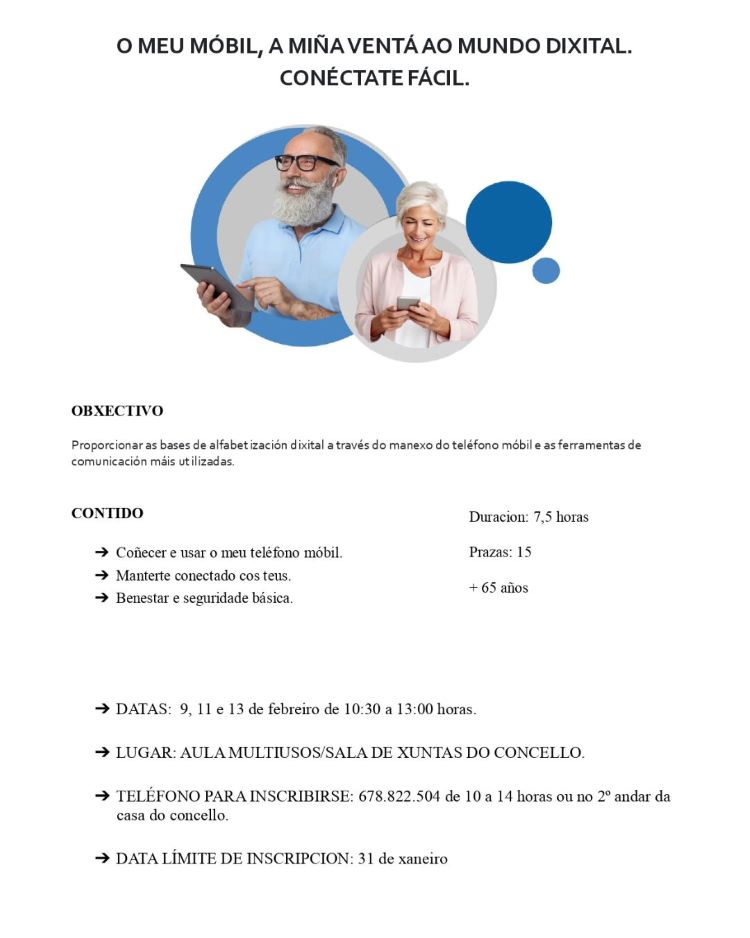 O primeiro curso, titulado “O teu móbil, a miña ventá ao mundo dixital. Conéctate fácil”, está dirixido a persoas de máis de 65 anos. A formación proporcionará as bases de alfabetización dixital a través do correcto uso do teléfono móbil e as das ferramentas de comunicación máis utilizadas. Levarase a cabo os días 9,11 e 13 de febreiro, de 10,30 a 13,00 horas.