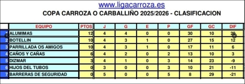 Te envio los resultados de la jornada 5 con los tres partidos jugados y el aplazado de la jornada 4 que fue Caños y cañas contra Aluminas. También te envio la clasificación de Copa a dia de hoy