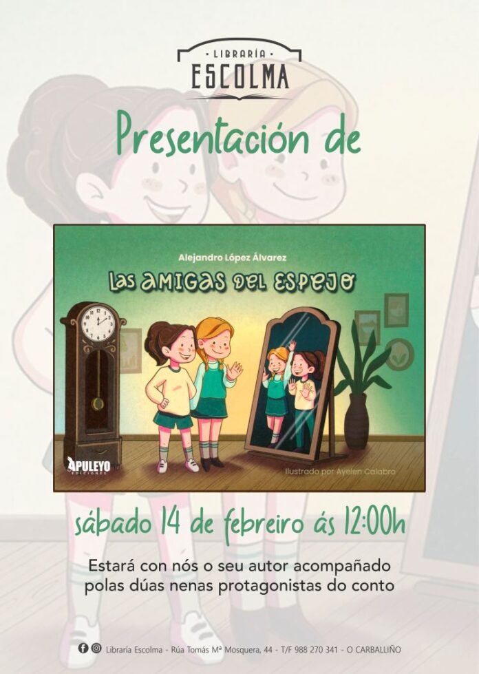 O vindeiro sábado, 14 de febreiro, a Libraría Escolma acolle, ás 12,00 horas, a presentación do libro “Las amigas del espejo”, un conto do que é autor Alejandro López Álvarez, que estará acompañado no acto polas súas propias fillas, nenas protagonistas da historia.