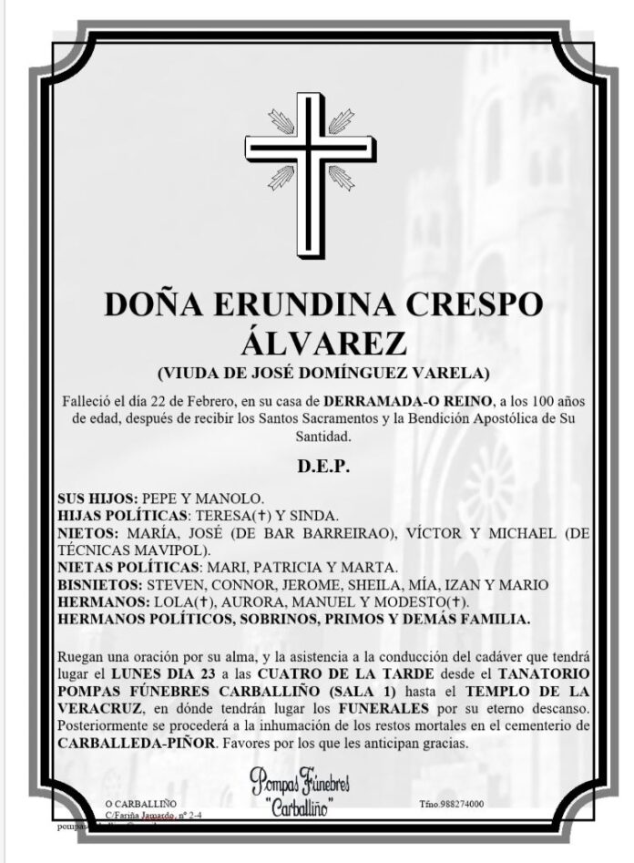 ActualidadeDestacadoCarballiñoO CarballiñoPiñor Falecemento de Doña Erundina Crespo Álvarez 23 Febreiro, 2026 FacebookTwitterWhatsAppLinkedinEmail TEATRO PRINCIPAL PROGRAMACIÓN NOVEMBRO TEATRO PRINCIPAL PROGRAMACIÓN NOVEMBRO ---------------------------------------------------------------------------------------------------------- TEATRO PRINCIPAL PROGRAMACIÓN NOVEMBRO TEATRO PRINCIPAL PROGRAMACIÓN NOVEMBRO PUBLICIDADE--------------------------------------------------------------------------------------------------- GRILL-CARBALLIÑO e OURENSE GRILL-CARBALLIÑO e OURENSE COMERCIAL ORCELLÓN COMERCIAL ORCELLÓN PRECASA: Ferretería e Materiales de construcción PRECASA: Ferretería e Materiales de construcción