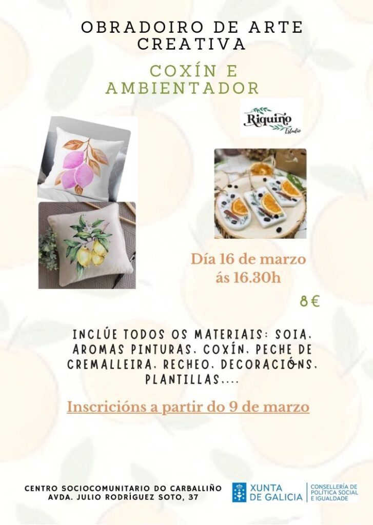 A segunda proposta, un obradoiro creativo, da man de Riquiño Ourense, no que as participantes poderán desfrutar dunha sesión práctica na que elaborarán un ambientador natural e un coxín, fomentando o traballo manual e a creación de obxectos sostibles para o fogar.