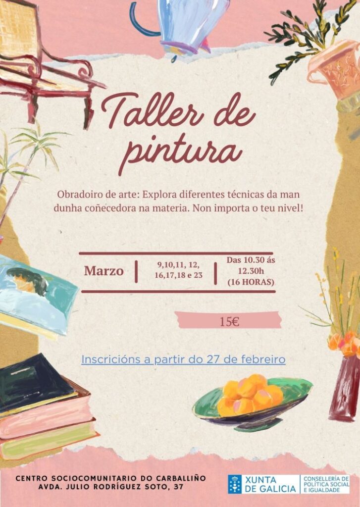 No apartado de formación e lecer, o centro aposta pola artesanía e a expresión artística con dúas propostas destacadas. A primeira, un obradoiro de pintura, impartido por Trebellos, que terá unha duración total de 16 horas. As clases realizaranse polas mañás, en horario de 10,30 a 12,30 horas, ideal para quen queira iniciarse ou perfeccionar a súa técnica pictórica.