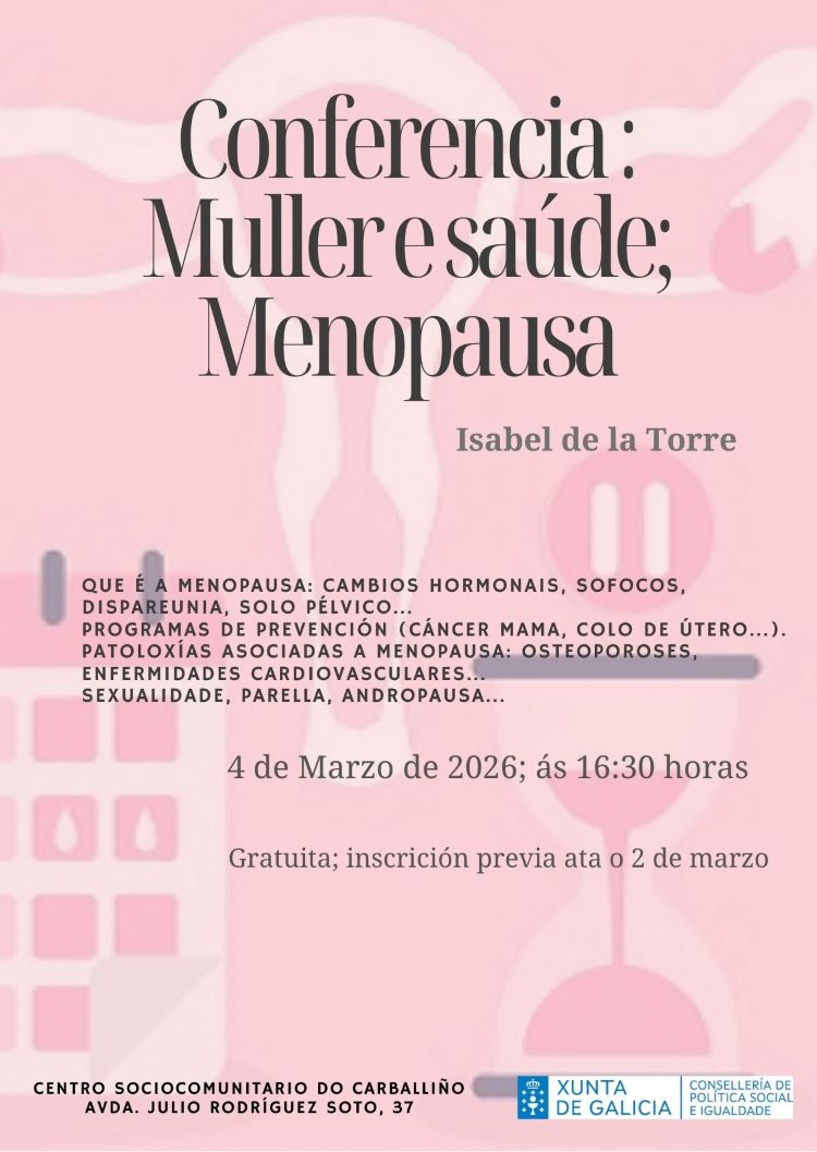 A programación arrancará o vindeiro 4 de marzo ás 16,30 horas, cunha cita clave para a saúde feminina: unha charla enfocada na menopausia. A sesión será impartida pola matrona Isabel de la Torre, nunha actividade promovida pola Escola Galega de Saúde. O obxectivo é ofrecer información rigorosa e ferramentas para afrontar esta etapa vital con calidade de vida.