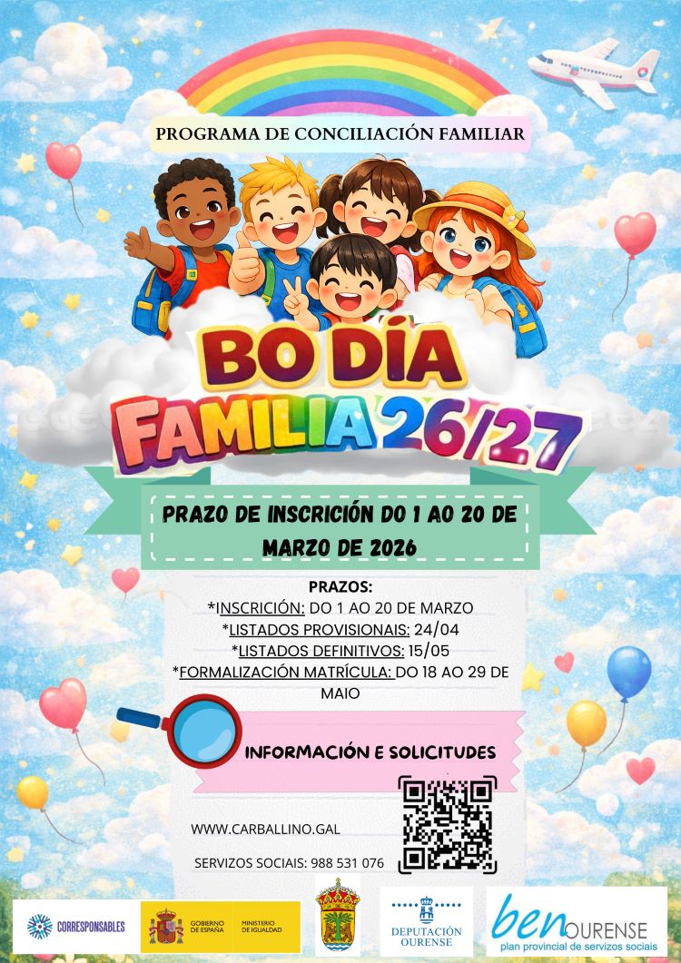 O Concello do Carballiño, a través da Concellería de Benestar Social, convoca o programa municipal de conciliación familiar ‘Bo Día Familia’ para o curso 2026/2027. O servizo inclúe a acollida, gardería e lecer durante as horas previas e posteriores á xornada escolar para mellorar a corresponsabilidade e o equilibrio entre a esfera profesional, persoal e familiar da poboación.