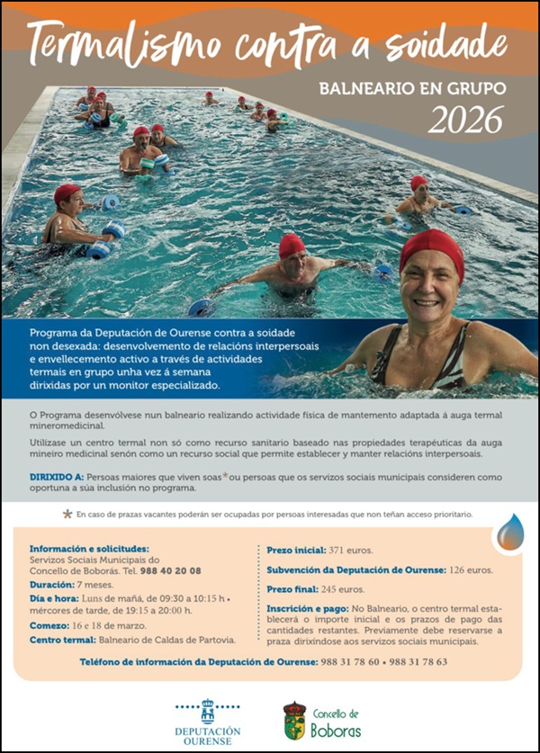 O Concello de Boborás informa de que está aberto o prazo para participar no programa da Deputación de Ourense “Termalismo contra a soidade”, unha iniciativa que promove o envellecemento activo e combate a soidade non desexada a través de actividades termais en grupo.