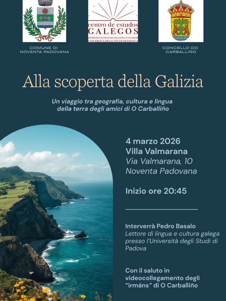 Deste xeito, o vindeiro 4 de marzo, terá lugar ás 20,45 horas, no salón de actos da Villa Valmarana, unha conferencia a cargo do profesor Pedro Basalo, lector de Lingua e Cultura Galega na Universidade de Padua, baixo o epígrafe “Descubrindo Galicia”.