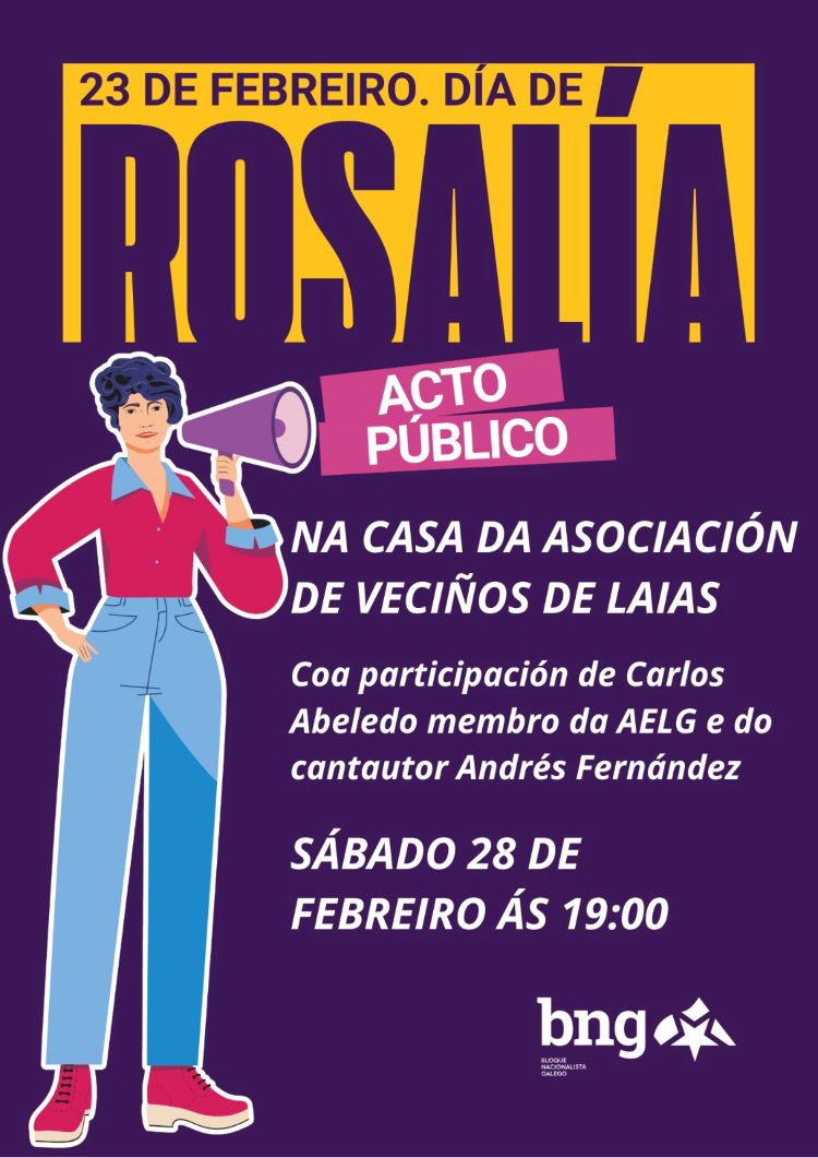 O Bloque Nacionalista Galego (BNG) do Ribeiro organiza este sábado, 28 de febreiro, ás 19,00 horas, un acto público na casa da Asociación de Veciños de Laias, no municipio de Cenlle, para conmemorar o Día de Rosalía, unha xornada de reivindicación da nosa lingua, da nosa cultura e do legado dunha das figuras centrais da literatura galega. O acto combinará intervencións institucionais, poesía e música, nun formato aberto á veciñanza.