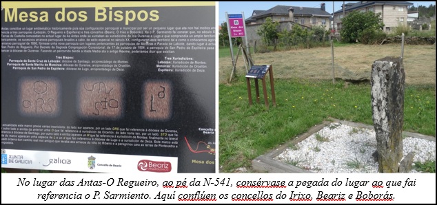 Ademais, despois de adxudicarlle unhas cen pías  -bautismais=  parroquias-, no norte do bispado de Ourense, engade que: ”los que caminarán desde Sotelo de Montes a Ribadavia, dejan a la derecha, antes de bajar al puerto del Paraño, los marcos o mojones en donde se juntan los tres obispados: Santiago, Lugo y Orense. Son famosos en las antiguas demarcaciones de los términos de los obispados de Galicia los sitios de Ysso y Cusanca o Cusancaro”.