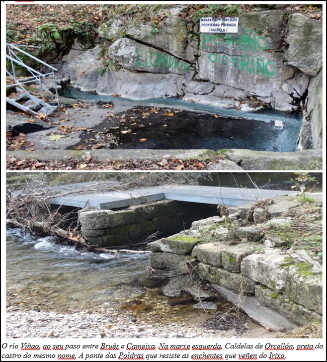 A continuación engade que “o nome da terra de Orcellón procedía do lugar onde se situaba o castelo homónimo… A situación do antigo castelo de Orcellón foi un enigma ata hai pouco tempo. Recentes descubrimentos arqueolóxicos de investigadores do Centro de Estudos Chamoso Lamas sitúan o castelo á beira do río Viñao, no termo de Caldelas de Orcellón, no linde entre as parroquias de Brués e Cameixa, no concello de Boborás”.