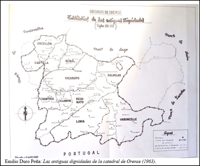 El sitio o territorio (arcedianato de Castela, pertencente á catedral de Ourense) comprende 65 feligresías, y cada una con muchos lugares, y si se añaden las 31 feligresías del territorio de Orcellón, que está al Norte de Castela y no tiene arcedianato especial, resulta un territorio de cien pilas  para el territorio de Castela o de la Castilla de Orense”.
