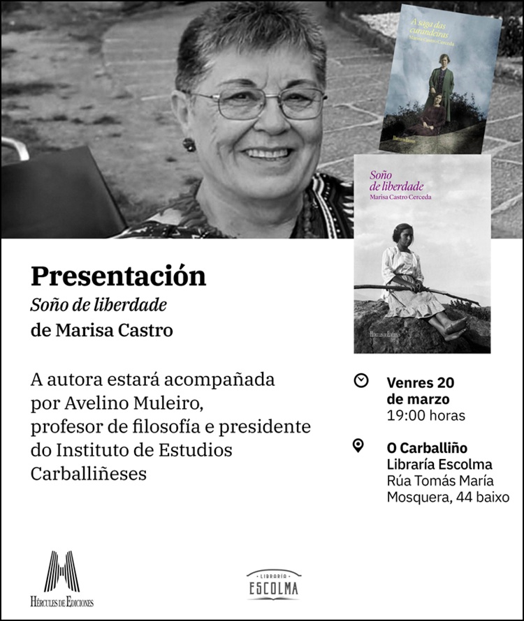 O CARBALLIÑO. 17-03-2026. O Carballiño convértese este venres no escenario protagonista para a literatura galega. A escritora e recoñecida investigadora Marisa Castro recala na vila do Arenteiro para presentar a súa segunda incursión na ficción: Soño de liberdade. O acto terá lugar este venres, 20 de marzo, ás 19:00 horas, nas instalacións da Libraría Escolma (Rúa Tomás María Mosquera, 44 baixo).