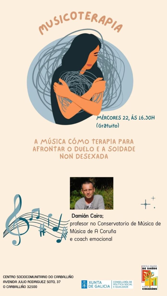 O programa continuará o luns 22 de abril, pola tarde, contando de novo coa presenza de Damián Cairo, recoñecido docente do Conservatorio da Coruña, coach e terapeuta emocional. Cairo, que xa deixou unha fonda pegada de éxito en anteriores colaboracións no centro, regresa para impartir un obradoiro gratuíto de Musicoterapia da Escola Galega de Saúde. Nesta ocasión, o enfoque será profundamente humano: utilizarase a música como unha ferramenta terapéutica para facer fronte ó duelo e a soidade non desexada. O obxectivo é ofrecer un espazo de apoio e acompañamento para unha parte importante da poboación que pode atopar na expresión