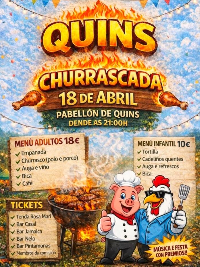 Para esta ‘churrascada’, que dará comezo ás 21,00 horas, o menú previsto de adultos consistirá en empanada, churrasco de polo e porco, auga, viño, bica e café, e cun prezo de 18 euros, mentres que a cativada poderá degustar tortilla, cadeliños quentes, auga, refrescos e bica, polo prezo de 10 euros.