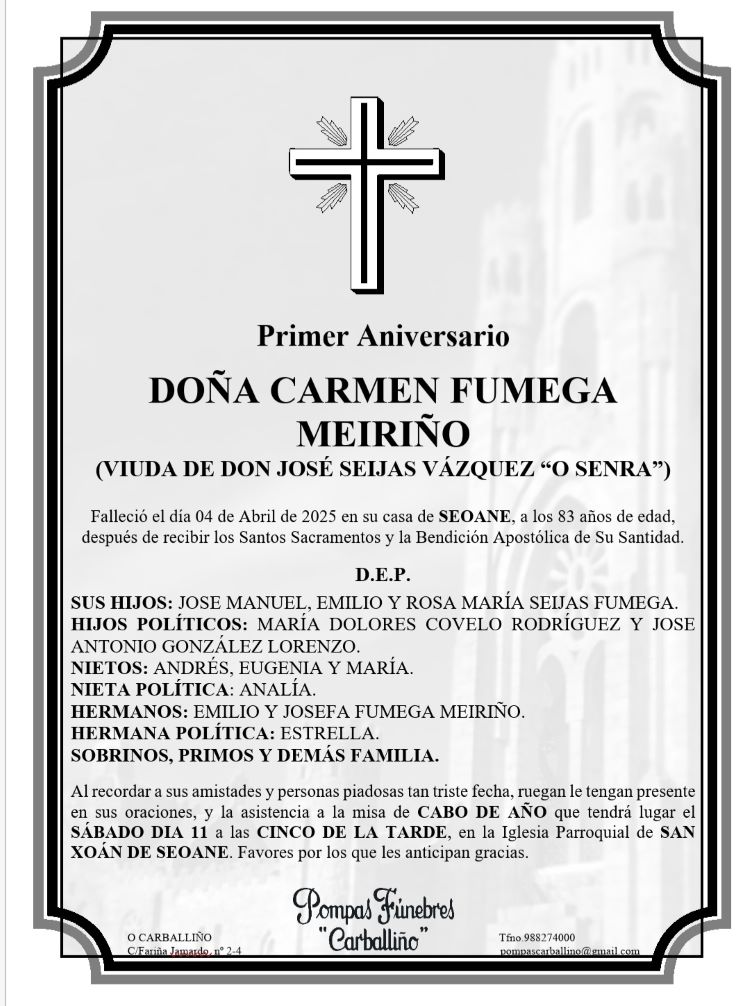 Esquelas 1º Aniversario de doña Carmen Fumega Meiriño (viúva de D. José Seijas Vázquez, ‘O Senra’) 10 Abril, 2026 FacebookTwitterWhatsAppLinkedinEmail TEATRO PRINCIPAL PROGRAMACIÓN NOVEMBRO TEATRO PRINCIPAL PROGRAMACIÓN NOVEMBRO ---------------------------------------------------------------------------------------------------------- TEATRO PRINCIPAL PROGRAMACIÓN NOVEMBRO TEATRO PRINCIPAL PROGRAMACIÓN NOVEMBRO PUBLICIDADE--------------------------------------------------------------------------------------------------- COMERCIAL ORCELLÓN COMERCIAL ORCELLÓN PRECASA: Ferretería e Materiales de construcción PRECASA: Ferretería e Materiales de construcción GRILL-CARBALLIÑO e OURENSE GRILL-CARBALLIÑO e OURENSE