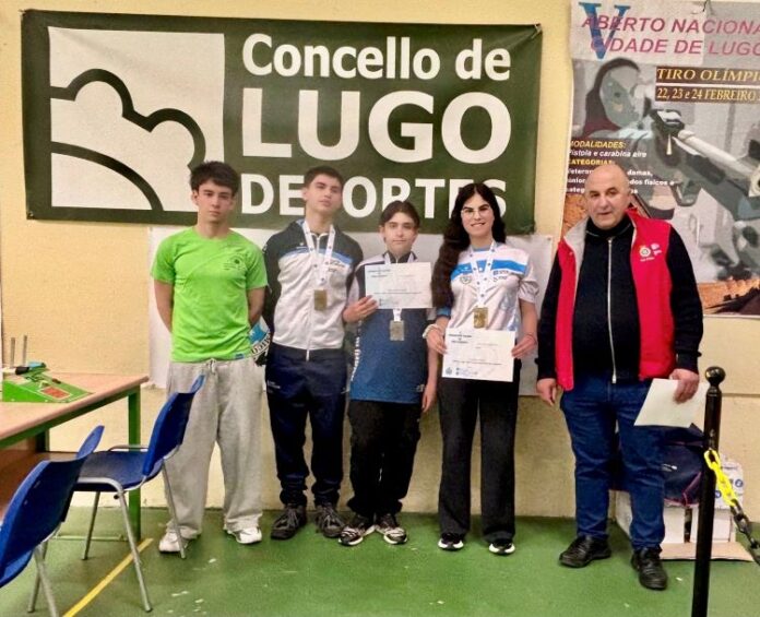 Na imaxe, os catro deportistas ourensáns (Roi, Breixo, Roberto Alonso e Paula, de esquerda a dereita), xunto co presidente da Federación Galega de Tiro Olímpico, Julio Rivas Iglesias.