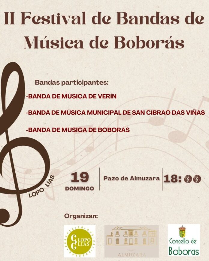 O vindeiro domingo, día 19 de abril, a Banda de Música de Boborás organiza o ‘II Festival de Bandas de Música’, que terá lugar no recinto do Pazo Almuzara a partir das 18,00 horas, con entrada totalmente libre.