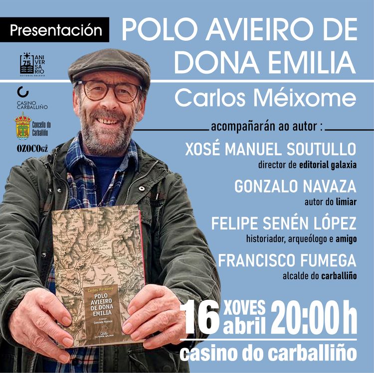 “Polo avieiro de dona Emilia” será presentado ao público en xeral o vindeiro xoves, 16 de abril, ás 20,00 horas, no Casino Cultural e Recreativo do Carballiño. Un acto no que Carlos Méixome estará acompañado polo director de Galaxia, Xosé Manuel Soutullo; o autor do limiar, Gonzalo Navaza; o historiador e arqueólogo Felipe Senén López, e o alcalde do Carballiño, Francisco Fumega.