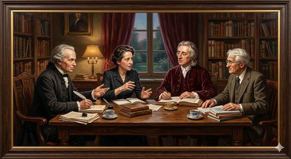 É a política a arte do que é -pragmática implacable- ou do que debe ser -reivindicación moral-? A IA elixiu dous líderes para este debate: Nicolás Maquiavelo e Immanuel Kant. A Mesa do Realismo, presidida por Nicolás Maquiavelo, representa a idea de quen ve o mundo sen filtros. Esta mesa representa o Estado, que non é un ente moral, senón un sobrevivente nunha contorna salvaxe. Os que sentan nesa mesa argumentan que a guerra non é un erro do sistema, senón o motor da historia. Nicolás Maquiavelo explica no Príncipe que o gobernante debe ser león para espantar lobos e raposa para coñecer as trampas (capítulo XVIII). A guerra é a única ciencia de quen goberna; sen ela, o Estado perece.