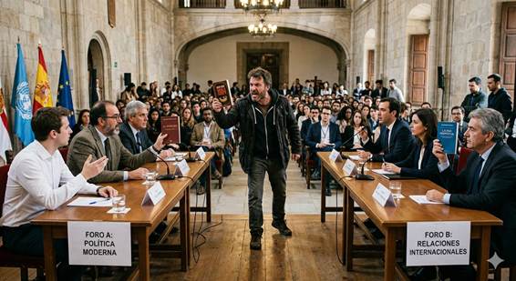 Na inexplorada illa Debataria, ese recóndito recuncho no metaverso da Utopía, a Intelixencia artificial -IA- instalou ad hoc un vixiado e custodiado foro heterotópico para promover un experimento intelectual: sentar en dúas mesas, fronte a fronte, ás dúas almas que dividen a nosa civilización: A Política do Realismo -poder e seguridade- fronte á Política do Idealismo -respecto á lei e á ética. A proposta é un debate en ambas mesas sobre a guerra.